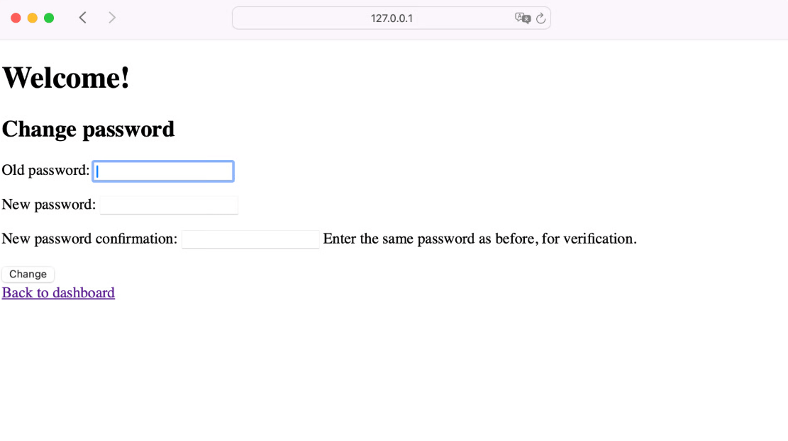 سيفرض Django الآن كلمات مرور قوية للمستخدمين الجدد. يمكنك الاطلاع على القواعد عند زيارة http://127.0.0.1:8000/accounts/password_change/ باستخدام مستخدم مسجل الدخول:
