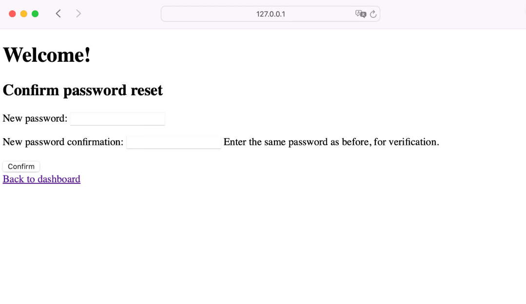جرّب طلب إعادة تعيين كلمة المرور. يبدو أن كل شيء يعمل كما هو متوقع في المتصفح. لكن دجانجو لا يرسل أي رسائل بريد إلكتروني حاليًا. للقيام بذلك، عليك إعداد بريد إلكتروني لمشروعك.