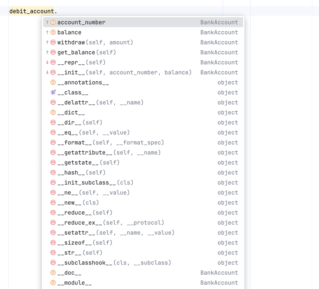 تُظهر الاقتراحات سمتي البيانات، .account_number و.balance، والتابعين .withdraw() و.get_balance(). أما بقية الاقتراحات فهي توابع خاصة ببايثون.